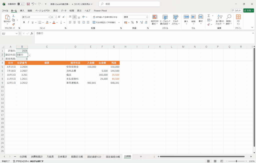 B1セルに表示したい評価年を西暦で入力し、B2セルにて表示したい資産科目を選択することで、B3セルに評価年の期首残高を表示し、5行目から評価年の入出金が表示される。